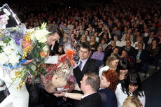 A legendary Maestro Gheorghe ZAMFIR was on the stage "Sala Palatului" in Bucharest to congratulate Vitas with his success. Mr Gheorghe ZAMFIR is a virtuoso who has four platinum discs and he has become a cult musician in Europe. He was surprised by the Artist's talent and prepared a special musical present, a composition devoted to the singer. During the press-conference in the presence of mass media from 12 European countries Mr ZAMFIR said his brilliant artistic talent and voice exceeding the legendary Farinelli had ensured Vitas "the sold out" all over the Europe. And producer Sergey Pudovkin got a surprise - a collection champagne with the name VITAS. The level of the interest to a legendary vocalist was so high in Europe, that the solo concert was shot by the First national TV channel with the following broadcasting all over the European channels. Spoilt by various shows Europe welcomed Vitas and applauded him.